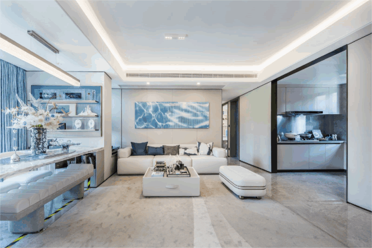 :将客厅面宽最大化到约5.5米,这种尺度感一般在四房大平层产品上比较常见,合理利用阳台与大落地窗,不仅延伸了视野,还将餐客厅与阳台连成一体,让整体空间过渡自然,更显通透、明亮;
