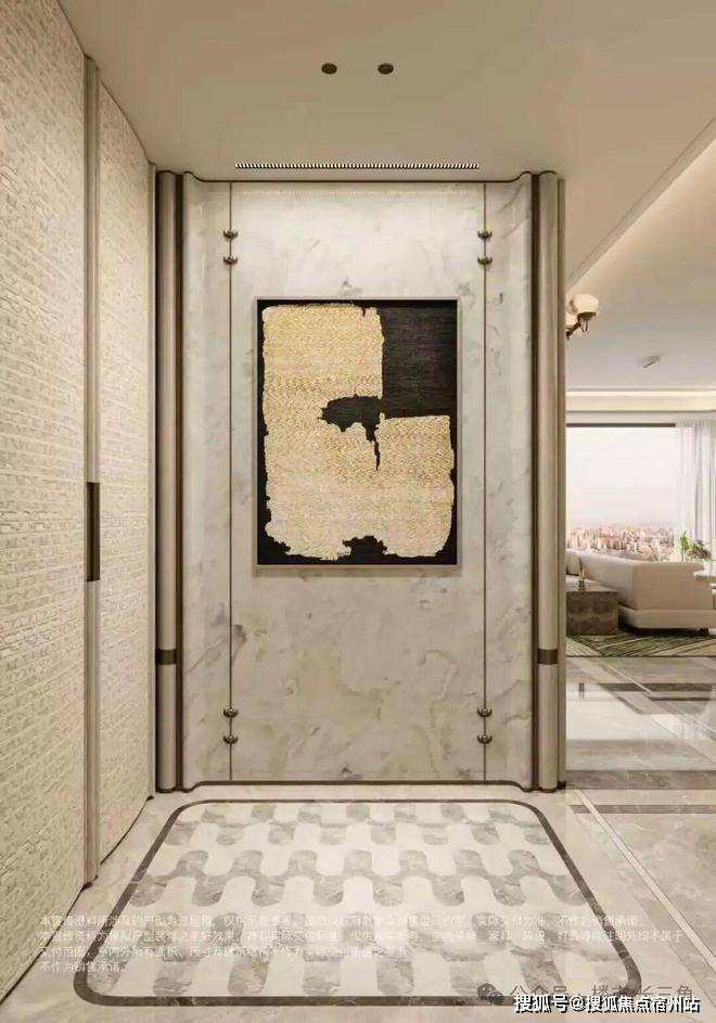 黄金贝壳的石材、风声水起曲线金属+背景墙岩板+金属墙布、主卧标配约4.2米超大面宽定制皮革背景墙...上海杨浦-保利外滩曜售楼处电话:【官网】☎️☎️✅✅